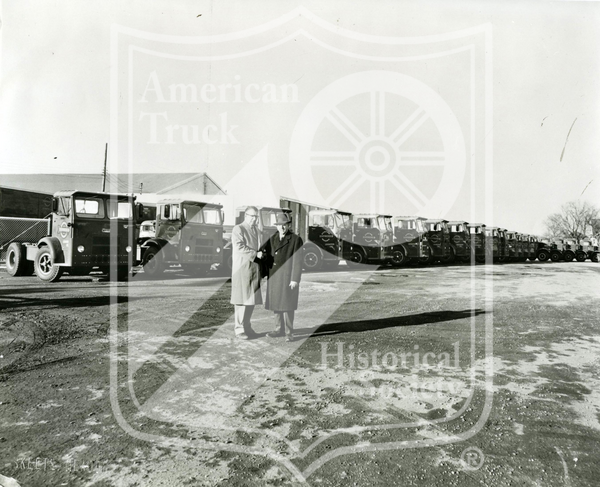 Caption: Two Unidentified Gentlemen, Shaking Hands, in Front of Large Fleet of White Tractors. Company Signing is Difficult to Make Out but Appears to Include the Words Moore and Express.